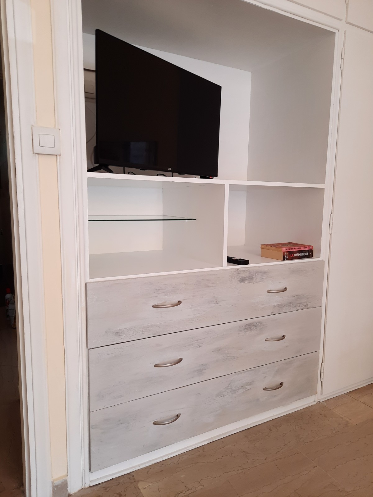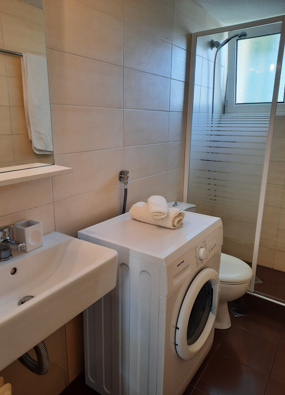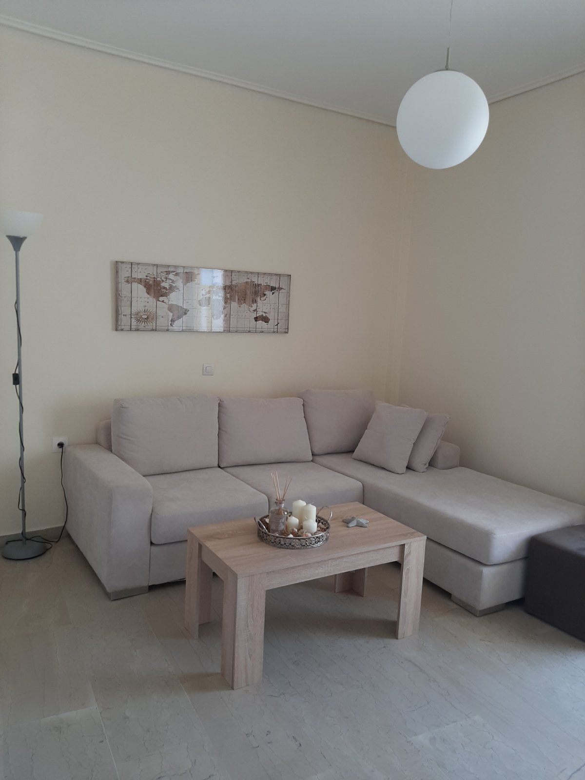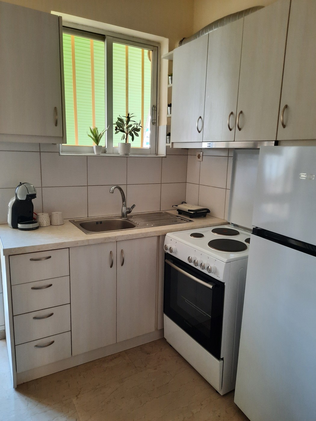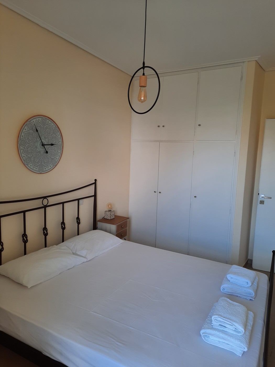 The air-conditioned apartment of 60sq.m. includes 1 bedroom with a double bed, a living room with a sofa bed, a fully equipped kitchen with fridge and coffee maker, and a bathroom with shower and hairdryer. There is also a flat-screen TV.